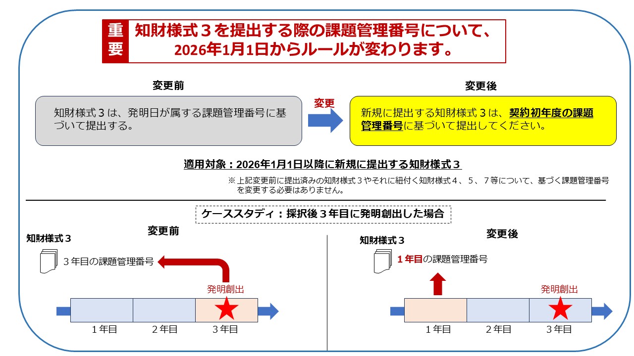 バイ・ドール報告受付システムによるAMEDへの発明報告(知財様式3)の提出に関するルールが変更になります。対象は、2026年1月1日以降に新規に提出する発明報告(知財様式3)になります。同日以前に提出されている知財様式3については変更等する必要はありません。ご不便をおかけしますがよろしくお願いします。