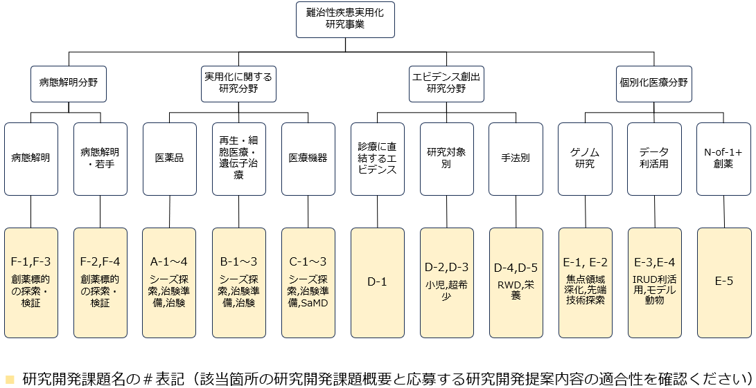 E-1 | 希少難治性疾患の個別化医療の推進等に資する研究分野 | 希少難治性疾患の個別化医療の実現に向けたゲノム研究(焦点領域深化型研究) | 1課題あたり年間 50,000千円(上限) |