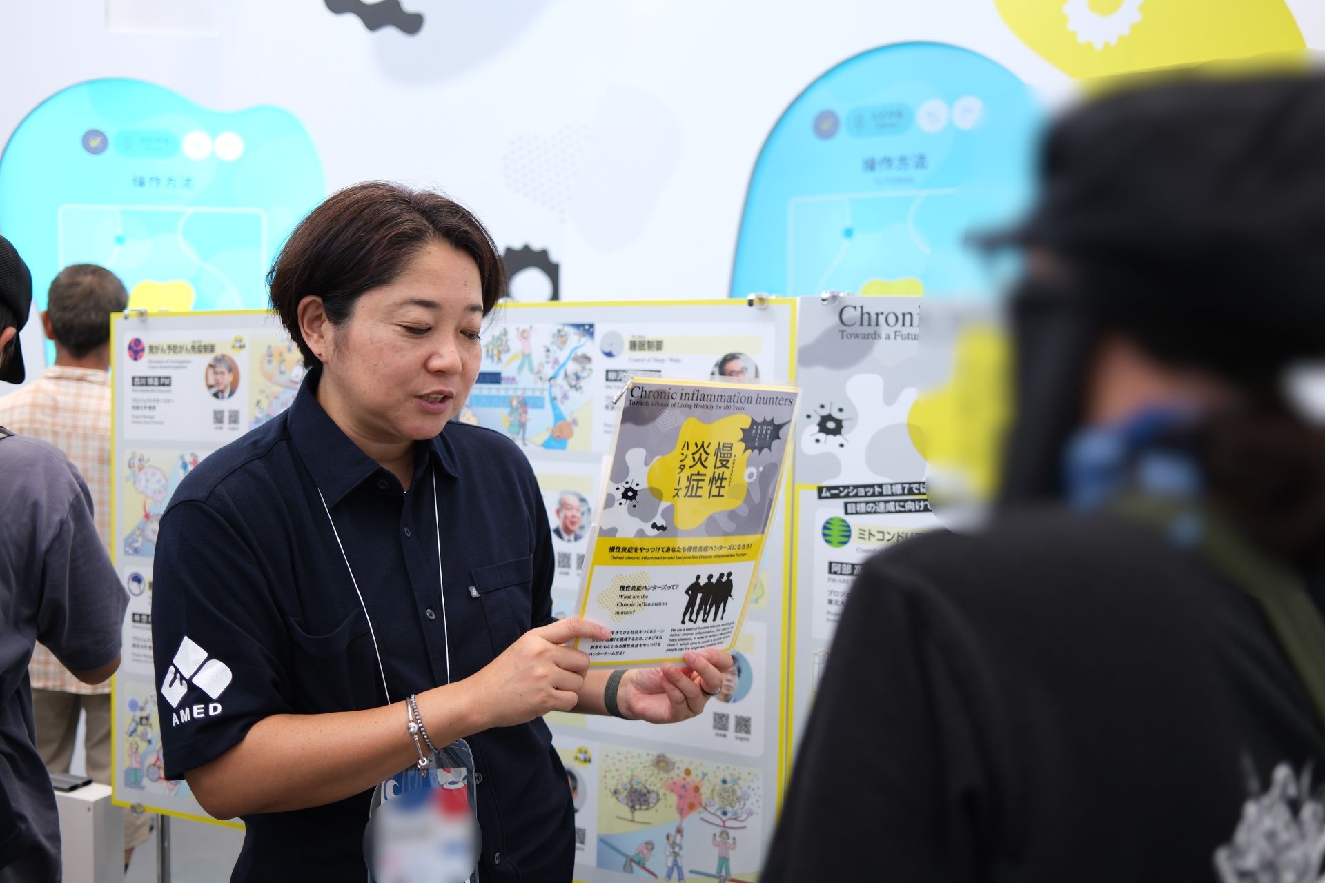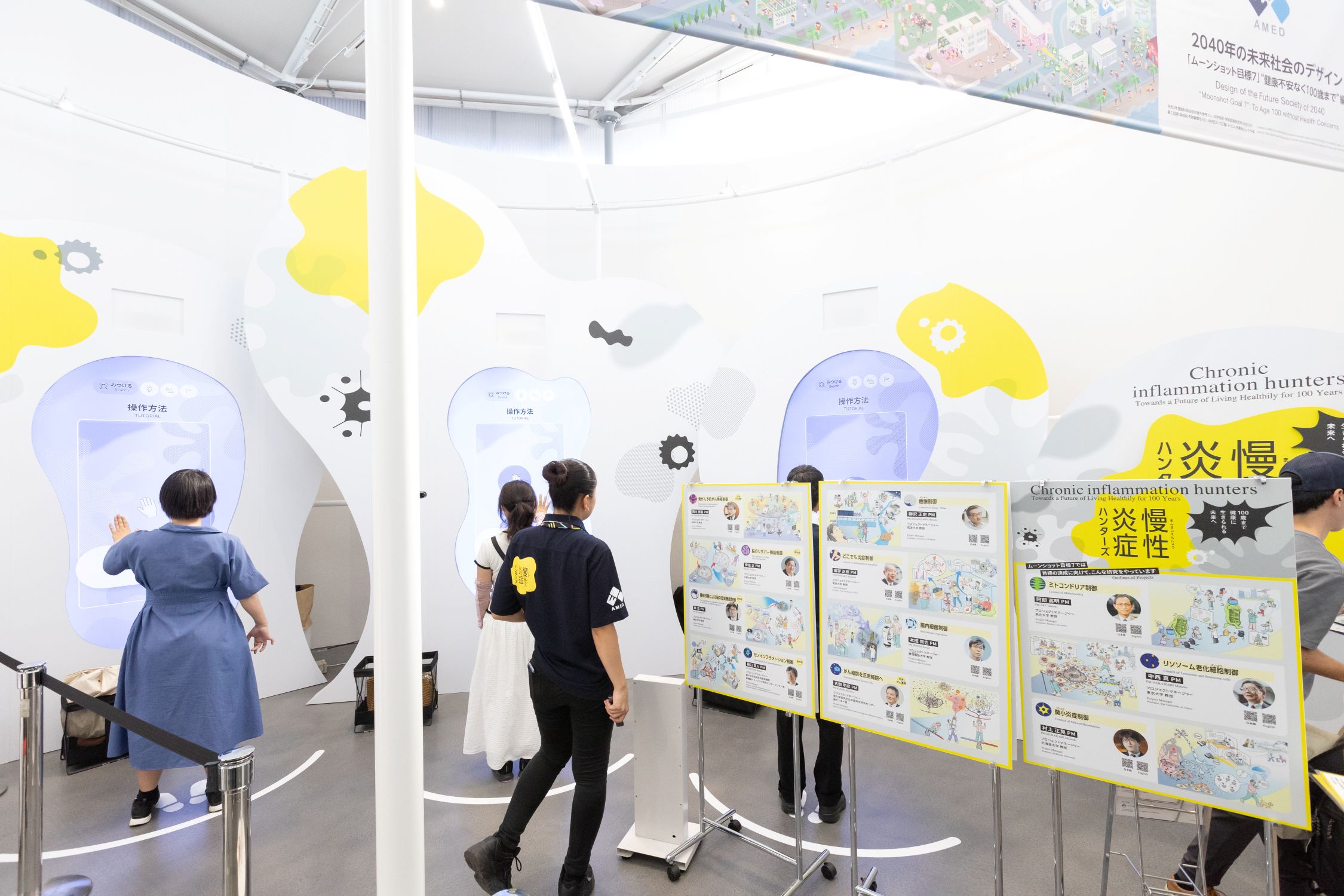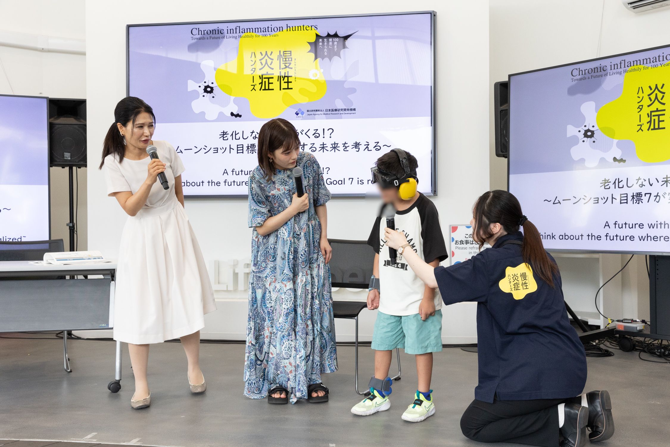 大阪・関西万博「フューチャーライフエクスペリエンス(FLE)」にて、ムーンショット目標7のキーワードである「慢性炎症」を広く知っていただくための体験型イベントを行いました。ブースコンテンツでは、来場者に「慢性炎症」を倒すハンターとなってもらい、ゲームに挑戦いただきました。ステージコンテンツでは、慢性炎症ハンターズの作戦会議と題したワークショップとタレントの井上 咲楽さんをお迎えしたトークイベントを開催しました。 皆様と一緒に「慢性炎症を克服する秘密道具」や「ムーンショット目標7が実現する未来」について考えることができた貴重な時間となりました。