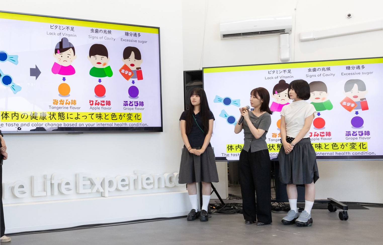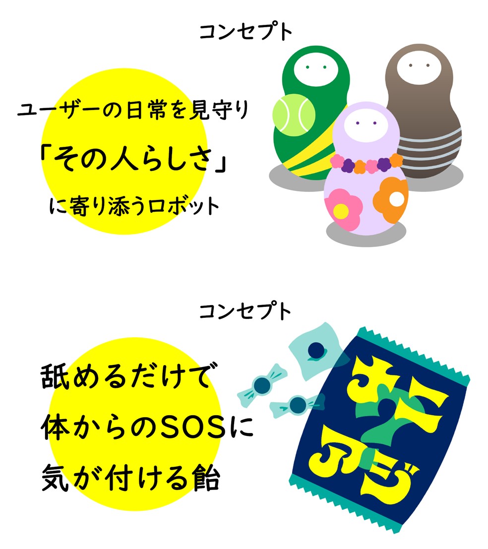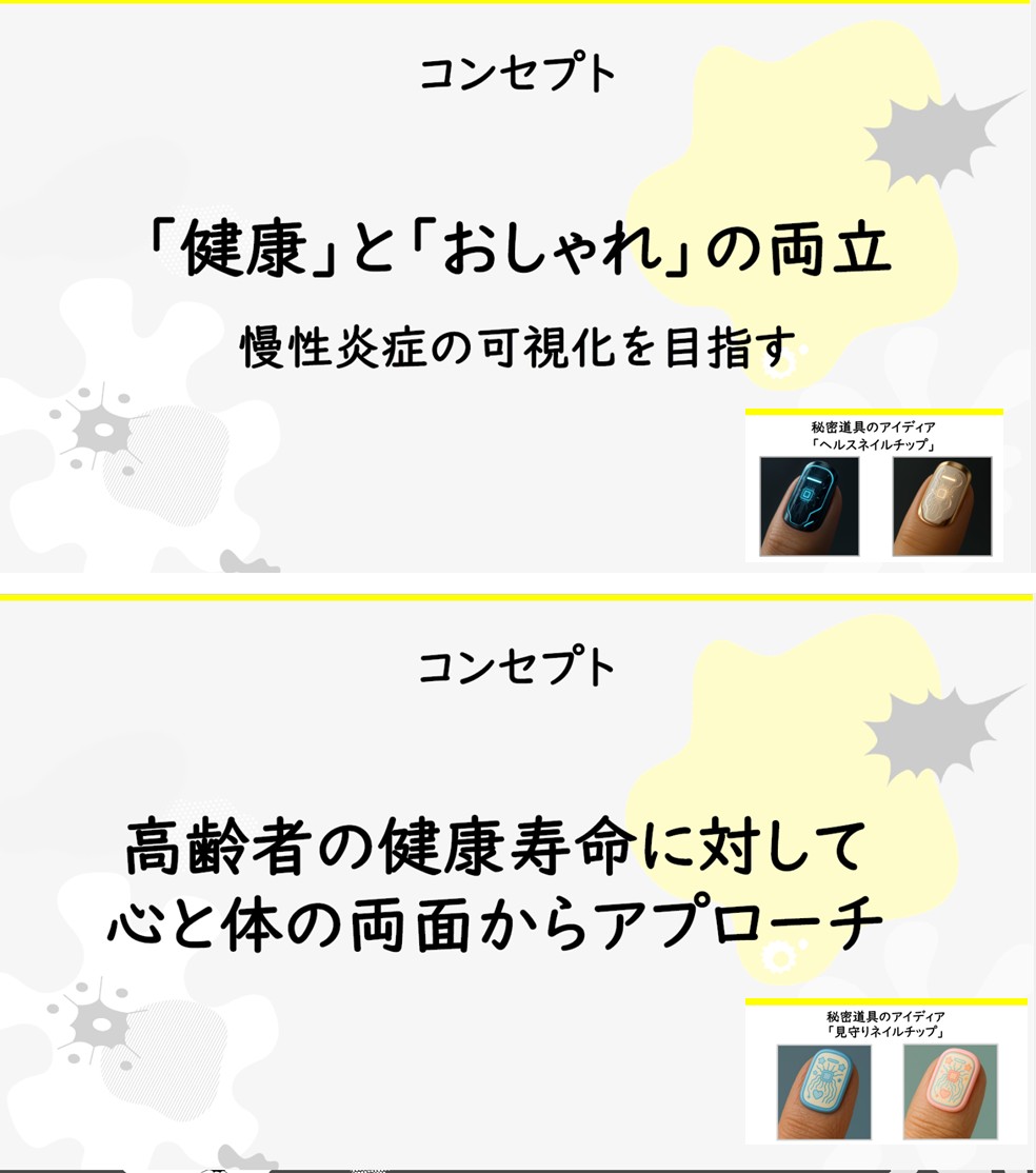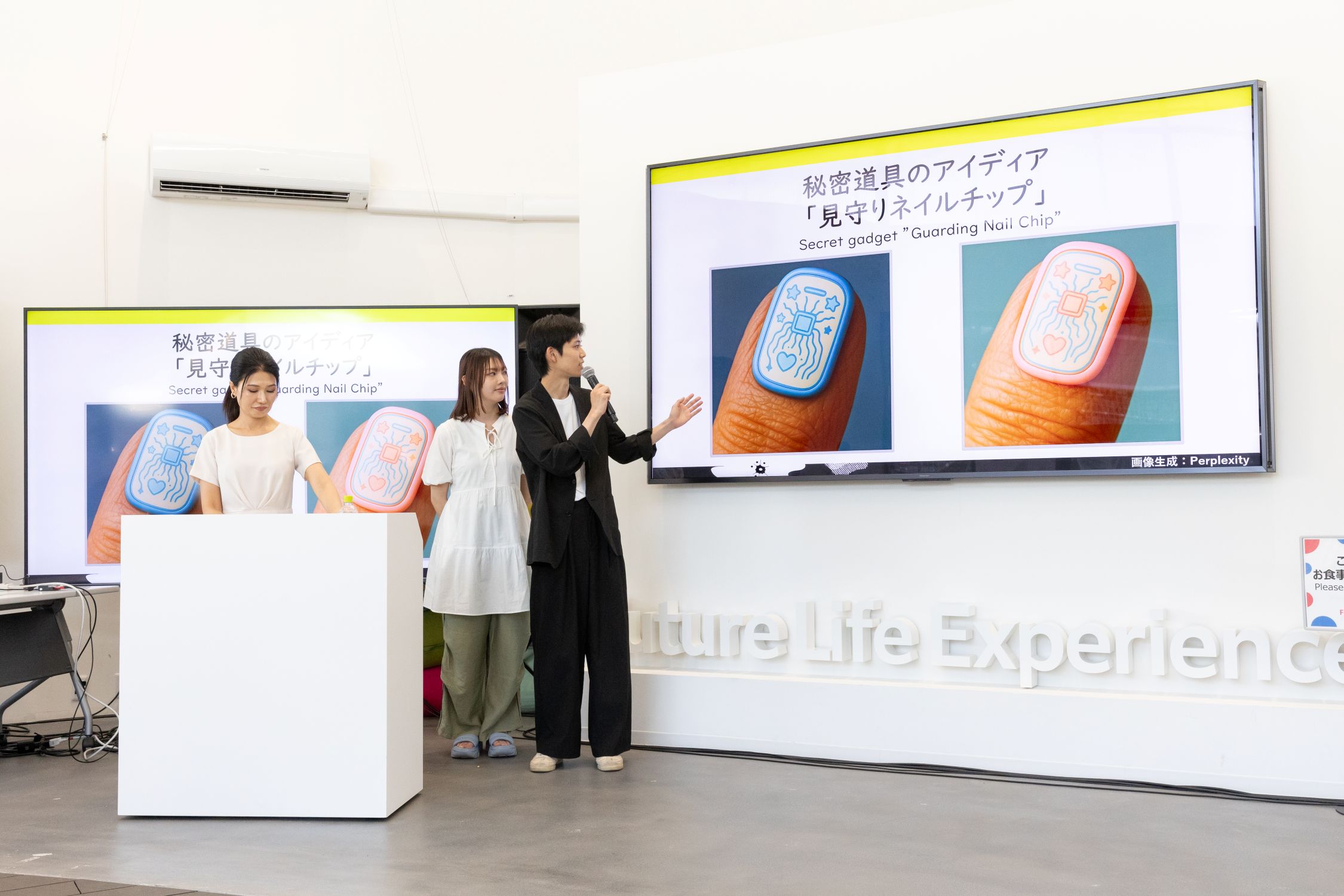 法政大学チームのアイディア発表。 「ユーザーの日常を見守り、″その人らしさ″に寄り添うロボット」や「舐めるだけで体からのSOSに気が付ける飴」成城大学チームのアイディア発表。「ヘルスネイルチップ」や「見守りネイルチップ」大学生・参加者が一緒に考え、アイディアを出しました。
