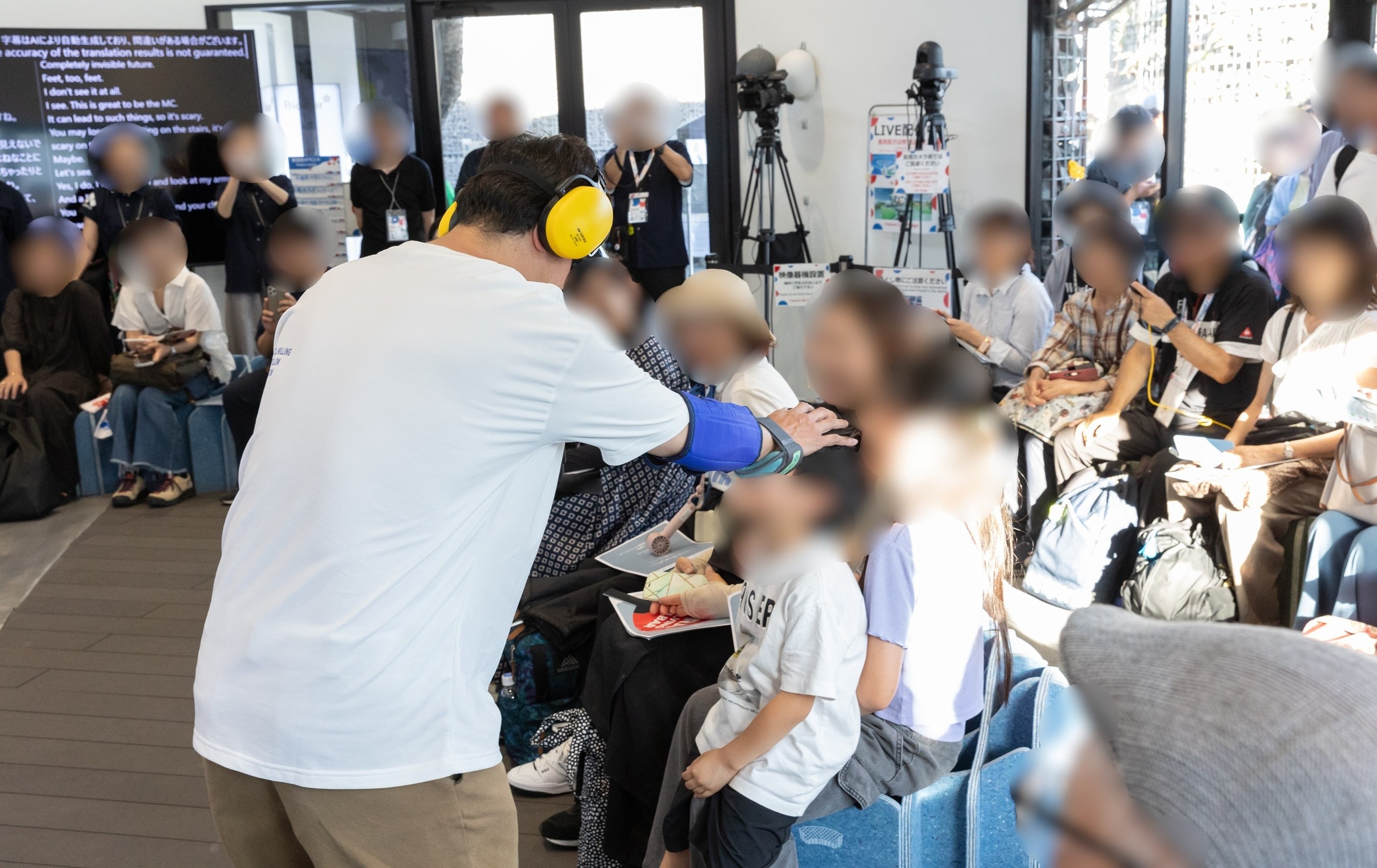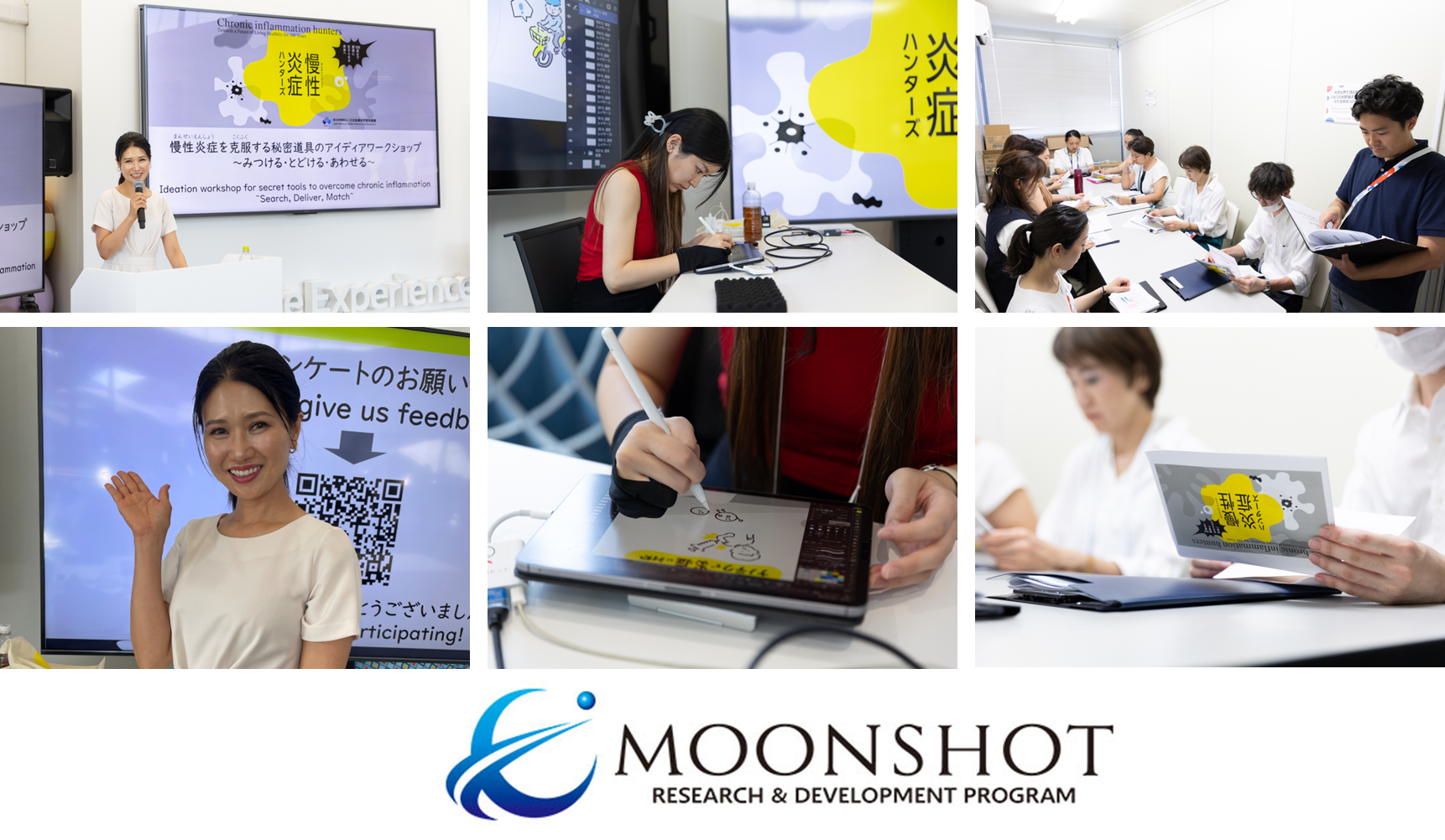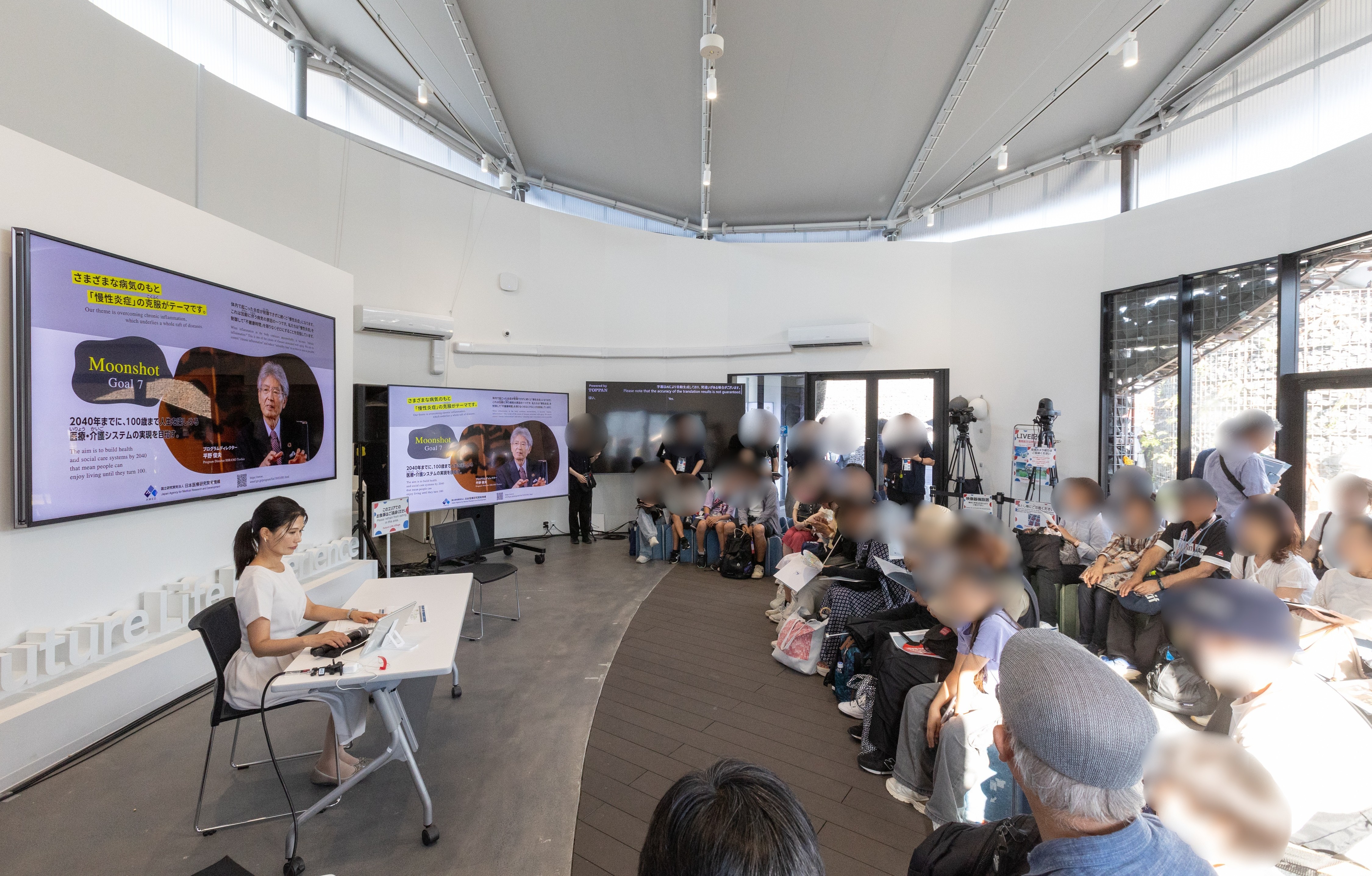 大阪・関西万博「フューチャーライフエクスペリエンス(FLE)」にて、ムーンショット目標7のキーワードである「慢性炎症」を広く知っていただくための体験型イベントを行いました。ブースコンテンツでは、来場者に「慢性炎症」を倒すハンターとなってもらい、ゲームに挑戦いただきました。ステージコンテンツでは、慢性炎症ハンターズの作戦会議と題したワークショップとゲストをお迎えしたトークイベントを開催しました。 皆様と一緒に「慢性炎症を克服する秘密道具」や「ムーンショット目標7が実現する未来」について考えることができた貴重な時間となりました。