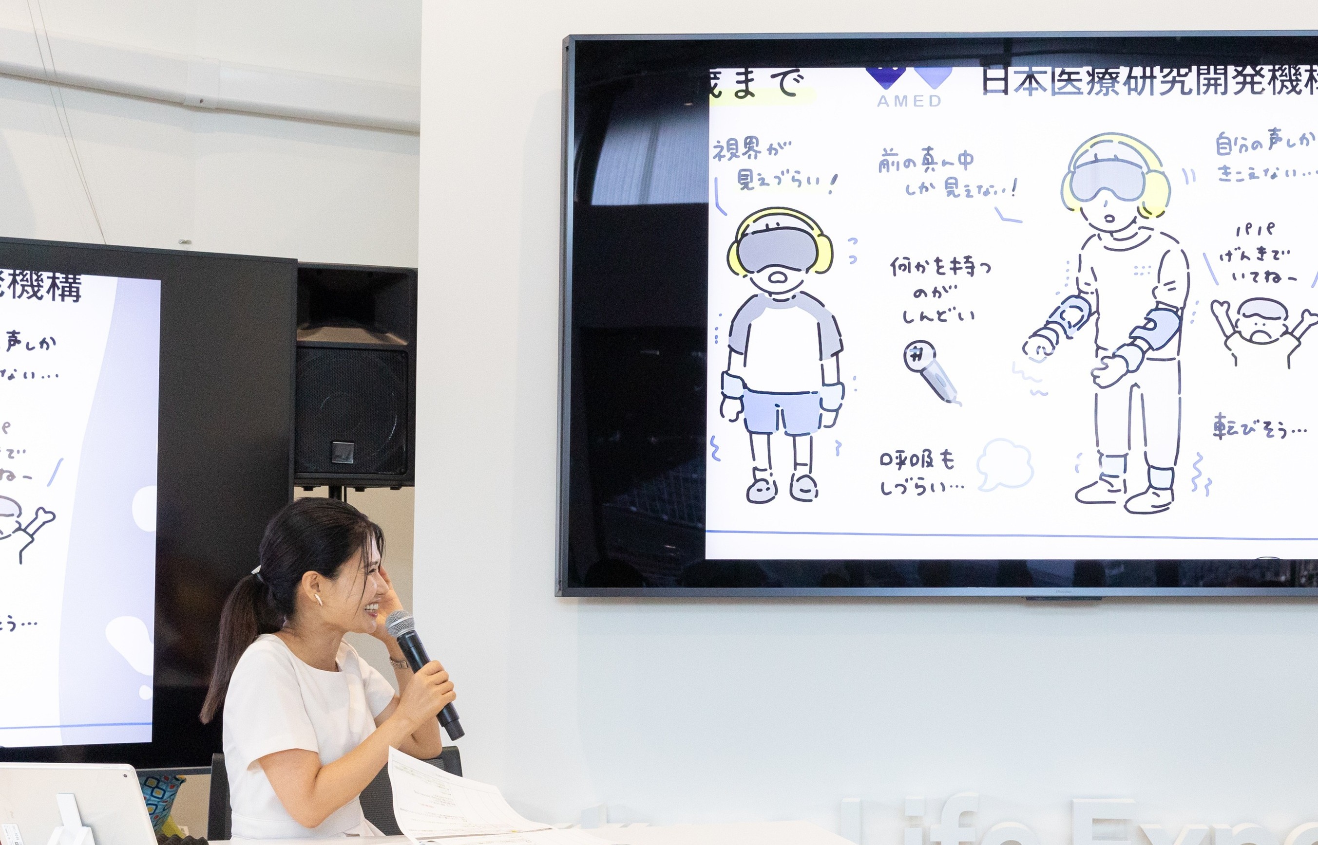 法政大学チームのアイディア発表。 「ユーザーの日常を見守り、″その人らしさ″に寄り添うロボット」や「舐めるだけで体からのSOSに気が付ける飴」