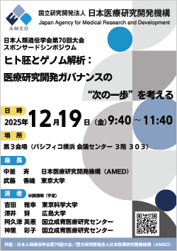 イベント 令和7年12月19日 日本人類遺伝学会第70回大会AMEDスポンサードシンポジウム「ヒト胚とゲノム解析:医療研究開発ガバナンスの”次の一歩”を考える」開催のお知らせ