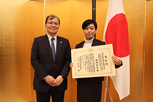 高市内閣総理大臣のご挨拶、内閣総理大臣賞をはじめ各大臣からの健康・医療戦略担当大臣賞等の授与に続いて、中釜理事長から日本医療研究開発機構理事長賞の授与を行いました。