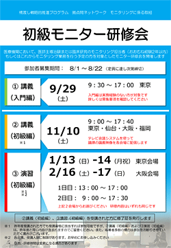 この研修では、講義と演習を通じて、モニタリングの基礎的知識・技術を習得していただき、自施設でのモニター、モニタリングの活動を通じ、臨床研究、医師主導を含む治験の適正な実施、品質の向上に貢献していただくことを目的としております。