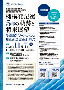 京都大学医学部附属病院 先端医療研究開発機構(iACT)は、令和7年11月7日に5周年記念シンポジウムを開催します。AMEDでは、2021年の橋渡し支援機関への認定のほか、2023年のAMED「再生・細胞医療・遺伝子治療研究実用化支援課題(規制・社会実装支援課題)」、2024年のAMED「優れた医療機器の創出に係る産業振興拠点(スタートアップ支援強化枠)」、2025年にはAMED第三期「異分野融合型研究開発推進支援事業」で支援を行いました。