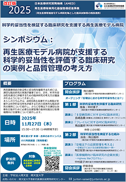 本シンポジウムは、AMED再生医療等実用化基盤整備促進事業の「再生医療等推進モデル病院を軸とした臨床試験等の施設連携」で採択している順天堂大学の再生医療等推進モデル病院が支援する科学的妥当性を評価するための具体的な臨床研究の実例について紹介します。さらに、再生医療等の安全性の確保等に関する法律の下での適切な治療を目指すために必要な品質管理の基本知識及び医療機関に向けた支援策について紹介します。
