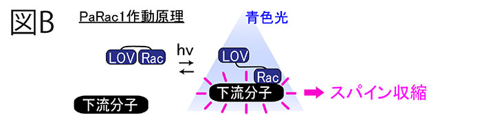 そこで、本研究グループは、学習・記憶時の長期増強に伴いスパインが増大することに着目して、長期増強を示したスパインだけを標識・操作するために、5種類の遺伝子を組み合わせた人工遺伝子である記憶プローブを設計し、生体内で記憶プローブ(蛋白質)を作り出すようにしました(図A)。その基本となるのは、PaRac1蛋白質という光遺伝学(注3)で使用される光感受性蛋白質です。この蛋白質は青色光を吸収すると蛋白質の立体構造が変化し、発現しているスパインを収縮させます(図B)。そこで、PaRac1を長期増強したスパインだけに集積するように細工し、集積したスパインを蛋白質の蛍光により“見える(可視化)”ようにしたものが記憶プローブです(図A)。実際にスパインに強い長期増強刺激を与え、そのサイズを増大させると(図C、矢頭)、記憶プローブが長期増強スパインに集積することを確認しました(図C、右図、赤丸)。
