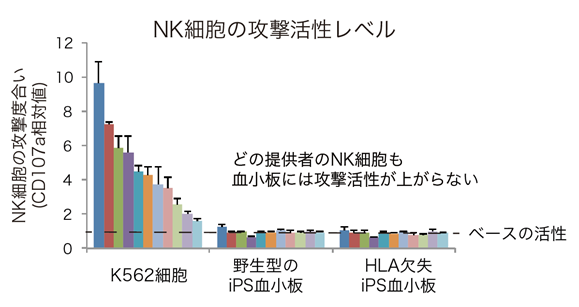 次に、HLAクラスIの発現を失った細胞を攻撃することが知られているNK細胞が血小板を攻撃しないかの検証を行うため、ヒトNK細胞と培養皿での共培養実験を行いました。10人以上の健常人ボランティアの血液から単離したNK細胞は、HLAクラスIの発現が欠失した白血病細胞株K562に対しては攻撃活性の指標であるCD107aの発現がはっきりと上昇していましたが、iPS血小板に関してはHLAの有無によらずCD107aの発現上昇は全く見られませんでした(図1)。
