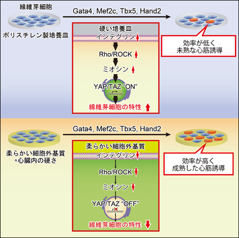 - 心臓再生法の一つとして、ウイルスベクターを使って、心臓線維芽細胞から心筋細胞を誘導(心筋誘導)する際、その足場となる細胞外基質(注1)の柔らかさが、心筋誘導効率を左右することを発見しました。