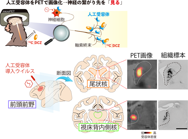 (右下)尾状核、視床背内側核における人工受容体に結合したPET薬剤から放射される信号の集積を示すPET画像と、脳組織標本における人工受容体の発現位置の対応。