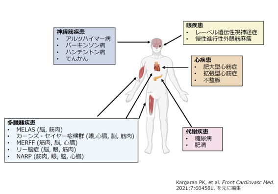 - 生命活動に必要なエネルギーであるATPの約95%を産生するミトコンドリアの機能異常により引き起こされる疾患です。ミトコンドリアは全有核細胞に存在するために、脳、心臓、腎臓、膵臓など全身のあらゆる臓器に障害が起きます。
