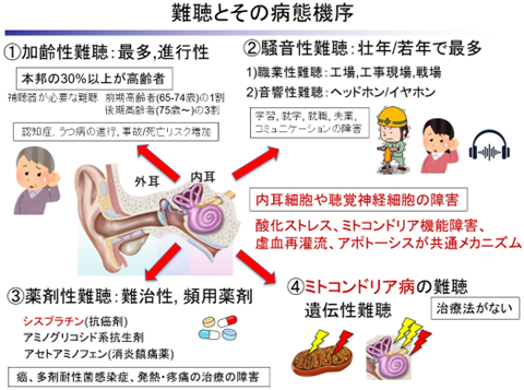 ミトコンドリアは、細胞内のエネルギー産生工場というべき細胞小器官であり生命活動維持に必要なエネルギー (ATP(注7))の95%を産生しています。ミトコンドリアの機能異常が起こるとATP産生が低下し、結果として全身の臓器障害、即ちミトコンドリア病を引き起こすことが明らかにされています(図1)。ミトコンドリア病の治療としてこれまでビタミン剤の内服などが行われてきましたが、その臓器障害は進行性で有効な治療薬がなく早期の治療法の発見が望まれていました。またミトコンドリア病患者の難聴以外にもミトコンドリアの機能異常は加齢性難聴、騒音性難聴、薬剤性難聴に関与する事が知られており、WHOによると65才以上の人口の30~40%が難聴によりハンディキャップを有しているとされますが、治療薬がないのが現状です(図2)。