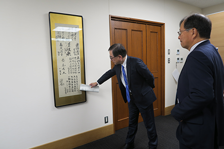 北大に残る歴史的な書を寶金総長より中釜理事長に解説