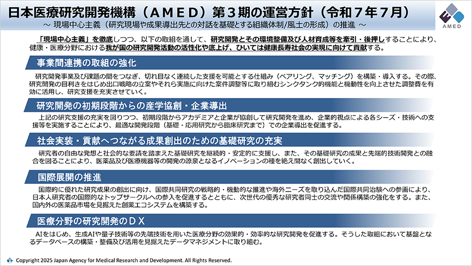 - 第3期の運営方針として「5本の方針」を設定しているのですが、その基となる議論は、AMEDの第1期・第2期から積み重ねてきたものです。