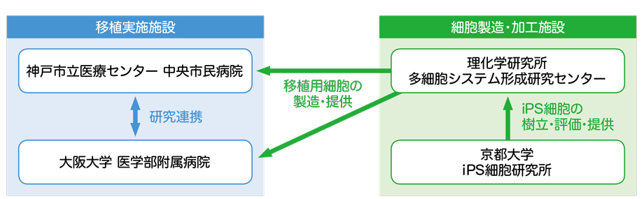 次のステップとして理化学研究所CDB、神戸市立医療センター中央市民病院、大阪大学大学院医学系研究科、京都大学iPS細胞研究所(CiRA)の4機関が共同で、他人のiPS細胞を使った臨床研究を開始しました。