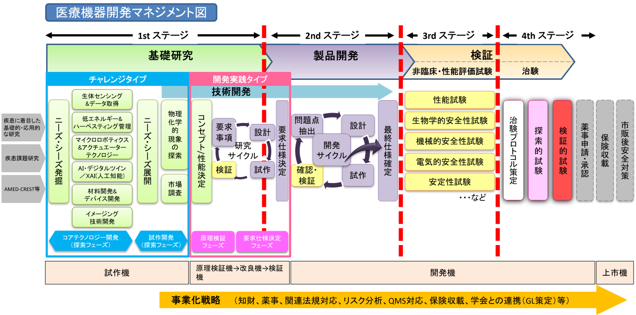 医療機器として薬事承認を取得することを目指して、AMEDの支援を受けながら、原則として翌年度の「開発実践タイプ」へ応募することが必須となります。