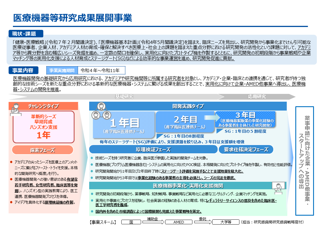 令和7年1月20日 終了若手あり令和7年度 (情報更新)「医療機器等研究成果展開事業 チャレンジタイプ【若手・女性研究者】」に係る公募について