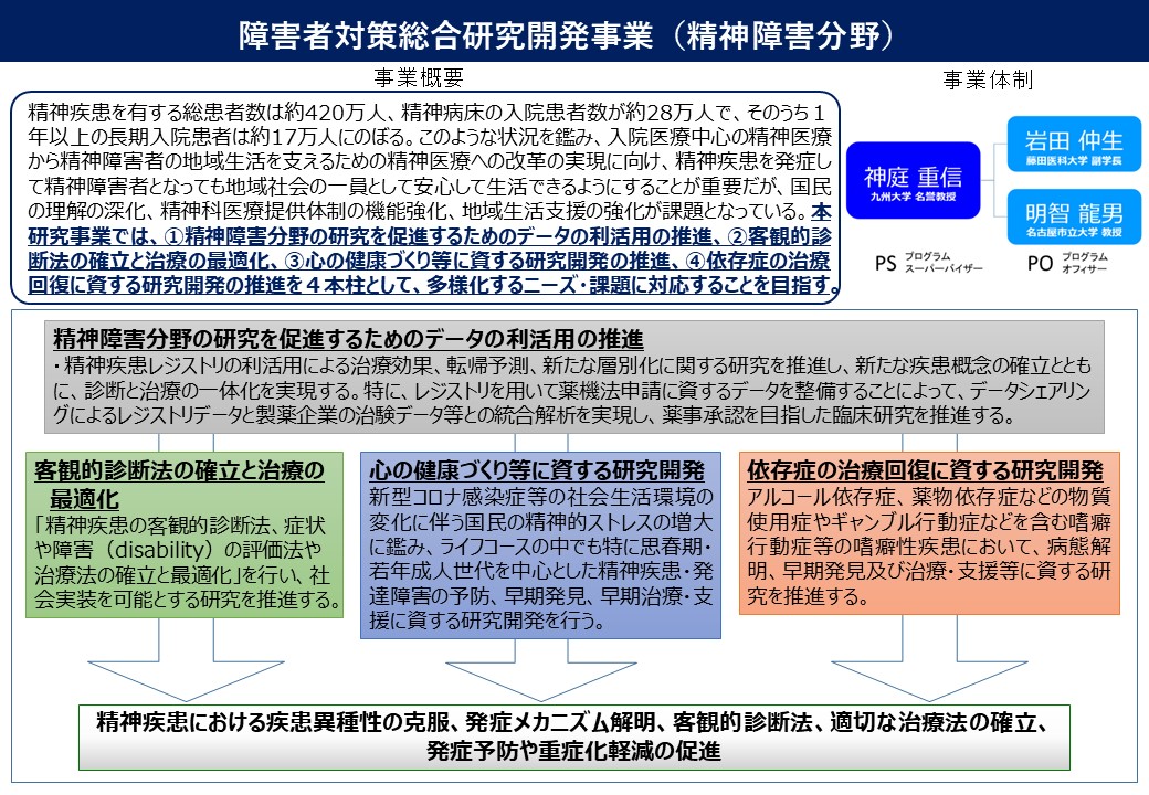 わが国における身体・知的・精神(発達障害含む)障害児・者の総数は936.6万人であり、人口の約7.4%に相当します。精神医療・保健のニーズは増大かつ多様化しています。この対策として、わが国では障害者総合支援法が定められ、難病も含めた障害児・者がその障害種別を問わず地域社会で共生できることを目的に、総合的な支援が推進されています。疾患を発症して障害児・者となっても、地域社会の一員として安心して生活できるようにすることが重要であり、本事業はその実現のための技術開発等を推進しています。