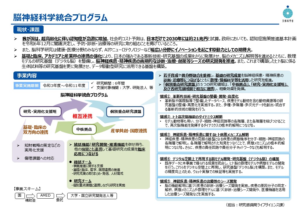 令和6年12月6日令和6年度 「脳神経科学統合プログラム(研究・実用化支援)」の採択課題について
