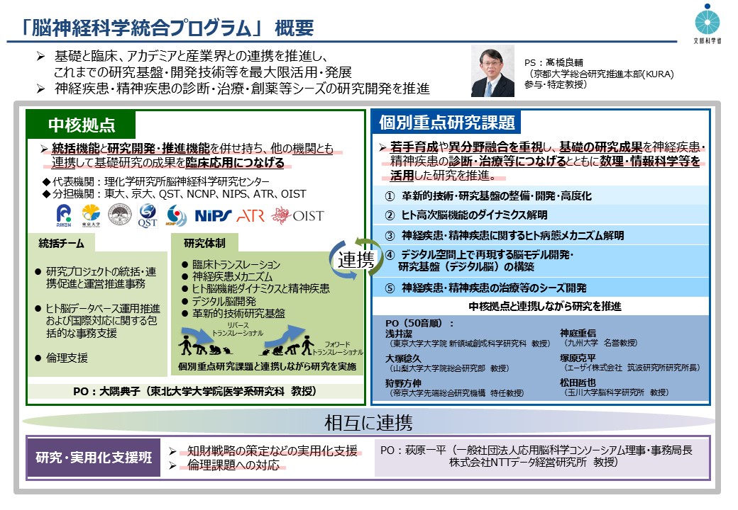 「脳神経科学統合プログラム」は、政府の「新しい資本主義のグランドデザイン及び実行計画」(2023年6月閣議決定)等に基づいて、これまでの「脳とこころの研究推進プログラム」を令和6年度に改組して創設された事業です。