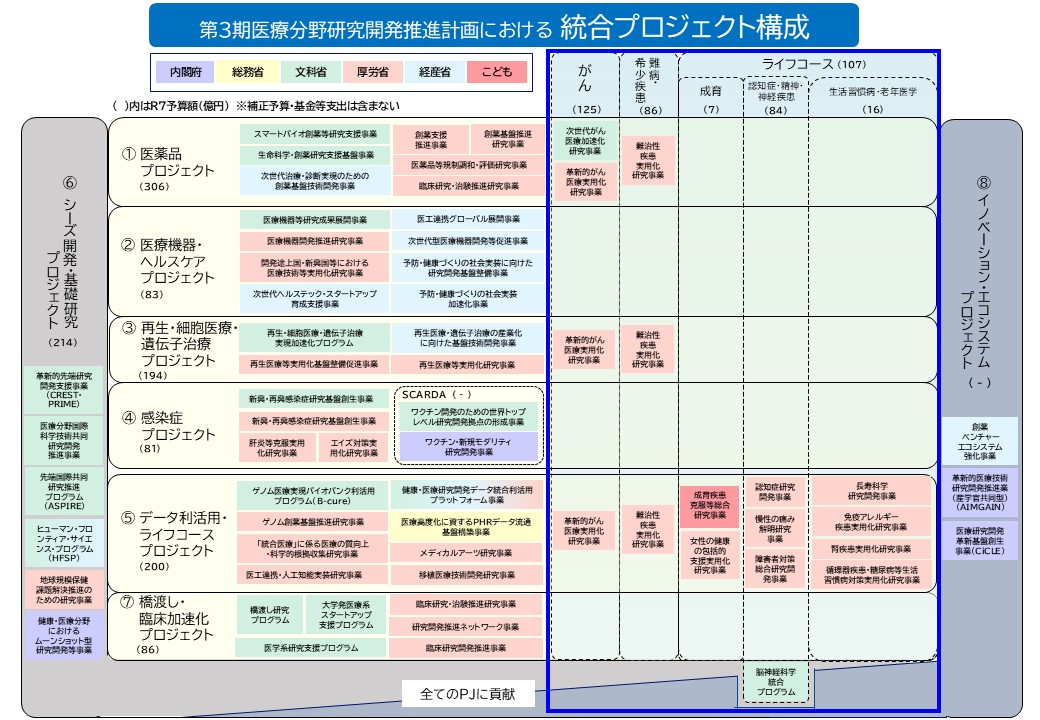 AMEDが推進する研究開発は、第3期中長期目標では、第2期中長期目標に引き続き、がん、難病の視点でプロジェクトを横断して連携協力を調整する体制を構築するとともに、生活習慣病、神経疾患・精神疾患、老年医学・認知症、成育、歯科口腔保健については、各疾患に注目しつつ、ライフコースの視点で全体的なマネジメントを導入して研究開発を推進します。